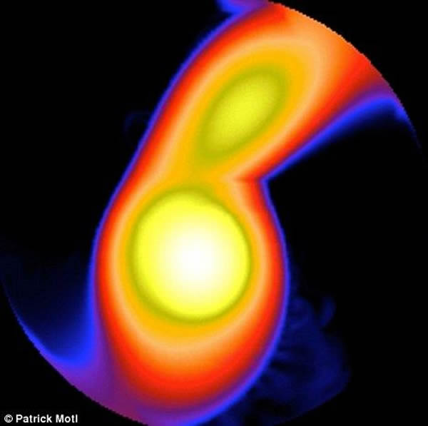 电脑产生的图片显示,随着时间推移,这两颗恒星的轨道离得越来越近,最终合并在一起,合并形成的新恒星的亮度在这段时间里也迅速增加,甚至比太阳亮3万倍。