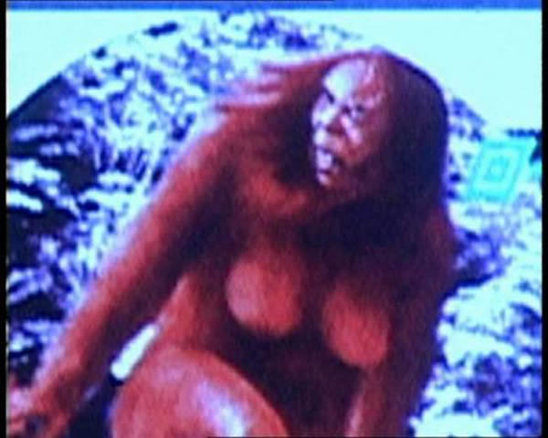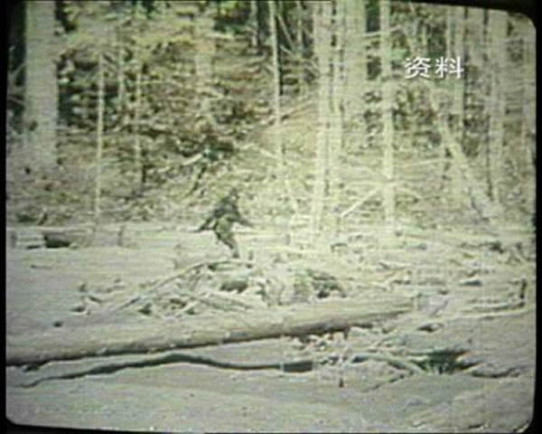 解说:1967年10月20日下午,美国生物学家帕特森和吉姆里骑马驰骋在加利福利亚州北部的兰湾山区,突然看到了让他们终生难忘的一幕。帕特森在跑动中开动了摄影机。这是世界上首次拍到的野人影片,历时17秒。