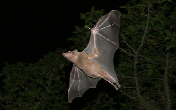 一些蝙蝠会在细雨中飞行,然而一旦遇到大雨,它们便会找地方躲起来。在5月3日的《生物学快报》网络版上刊登的一项新的研究给出了一个答案:当蝙蝠的皮毛和翅膀被打湿后,它们不得不更加卖力地飞行。在哥斯达黎加进行的一连串试验中,科学家对在一个八角形大笼子中飞行的索维尔短尾果幅(如上图)进行了研究。有时他们会用自来水把蝙蝠弄湿;有时蝙蝠会被雨水打湿。研究小组发现,与外表干燥时相比,蝙蝠被打湿后使用的能量是前者的两倍。在雨中飞行并没有什么区别,这排除了因雨点击打翅膀,或水的实际重量而产生的一些力学问题。科学家认为,就像大多数潮湿的哺乳动物那样,潮湿的蝙蝠会很冷,因此它们不得不更努力保持体温。并且随着雨水弄乱它们光滑的皮毛、打湿它们的翅膀,浑身湿透的蝙蝠可能也无法正常地运用空气动力。