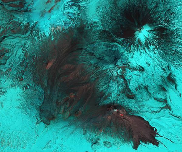 一幅伪色照片,由美国宇航局的一颗卫星于4月22日拍摄。照片中,俄罗斯别济米安纳(Bezymianny)火山喷出的火山灰覆盖了周围的多冰地带。这座火山4月14日开始喷发,火山灰高度达到2.5万英尺(约合7600米)。照片中,火山灰和裸岩呈灰色,雪冰则呈蓝色。红色“热点”为从火山顶部喷涌出的新熔岩,东南部一个面积较大的区域是一个熔岩流。