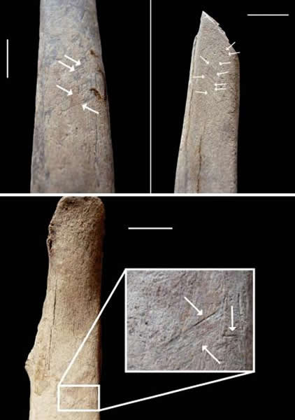 照片为有屠杀切口痕迹的猛犸象肋骨