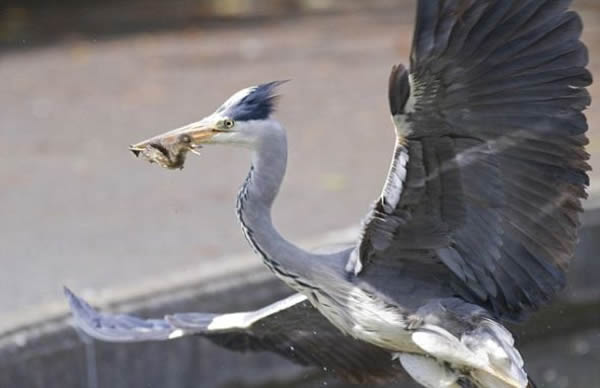 在爱尔兰首都都柏林的一个湖边,这只苍鹭突然猛扑下来,它试图通过这种方式惊吓鸭群,然后趁乱捕捉离群者,享受下一顿美餐。一只惊慌失措的鸭妈妈试图带领着它的8只鸭宝宝(刚出生一天)钻入湖边的芦苇丛里躲起来。然而老谋深算的苍鹭已经发现了这群鸭子的巢,它悄悄潜伏在那里等待鸭子靠近,然后轻而易举地捉到两只小鸭子。