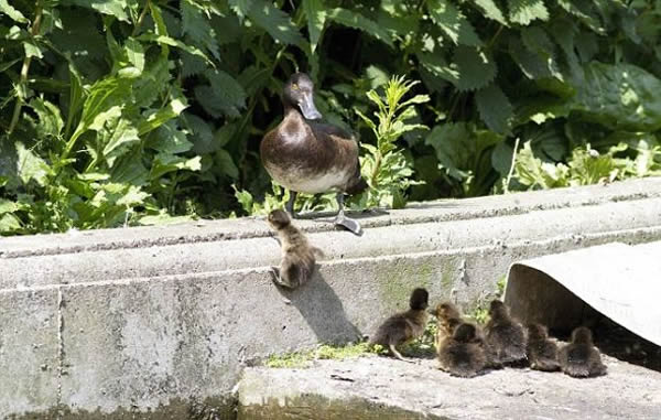 鸭妈妈拼命想让出生只有1天的小鸭子躲进附近的芦苇丛里