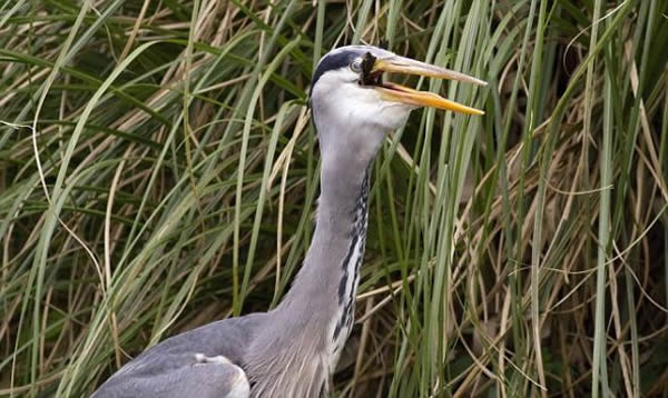 苍鹭站立时身高40英寸(101.6厘米),翼展77英寸(195.58厘米),重大约是4磅(1.81公斤),它们也是在每年的这个时候繁育后代。苍鹭妈妈每次产下4到5枚蓝色的卵,它们在孵化幼鸟期间需要继续进食,以免被饿死。苍鹭经常以小鱼或青蛙为食,它们是非常有耐心的动物,它们往往会一动不动地站很长时间,瞅准时机才会利用长长的喙迅速捕捉猎物。