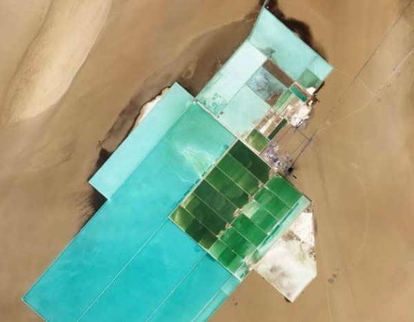 美国宇航局6月19日公布的一幅卫星照片,展现了中国塔克拉玛干沙漠中的太阳能蒸发池。照片中,太阳能蒸发池好似从沙丘中钻出,绿松石色和祖母绿色池水则犹如埋在沙子中的宝石一般。太阳能蒸发池允许矿工收集钾盐。这是一种基于钾的营养物,用于生产肥料。在史前时代,这一沙漠地区拥有一个巨大的咸水湖,干涸消失之后留下钾盐沉积物。