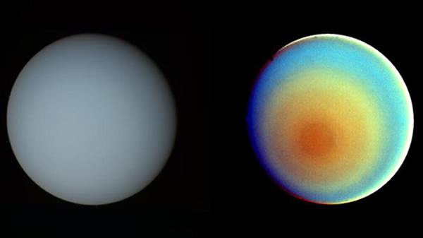 天王星四分之一时间,其一侧极地都直接照射在阳光之下,而另一侧极地则陷入黑暗之中。这张照片是1986年由美国宇航局海盗2号探测器拍摄的,显示南半球完全被照亮。2007年12月,天王星达到春分,意味着北极地区将长期接受阳光照射,一直持续至2028年。