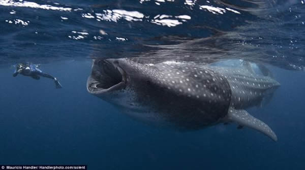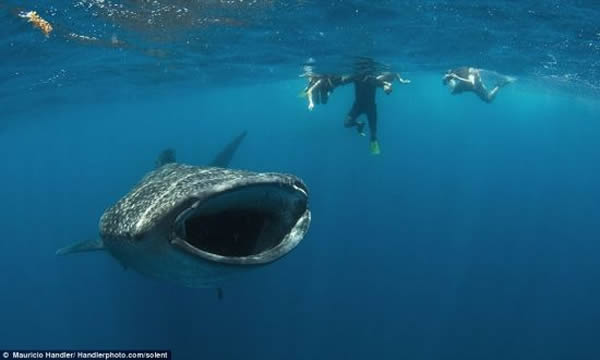 在墨西哥女人岛海域,摄影师马利希奥-汉德勒拍摄了一组令人惊异的照片,展现潜水员与鲸鲨共游海下的精彩瞬间。当时,鲸鲨正在享用浮游生物,几乎要将潜水员吞入口中。鲸鲨是海洋中最大的鱼类,性格非常温顺。在鲸鲨逐渐靠近时,潜水员迅速离开,毫发无损,而后继续与这种非凡的动物亲密接触。