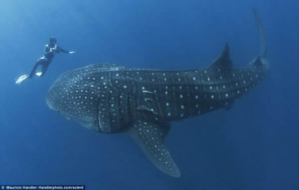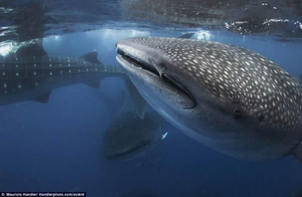 汉德勒说:“如果不小心被吸入鲸鲨的大嘴,鲸鲨也会将他喷出来。它们每年都到这里,捕食金枪鱼卵。这一年共出现大约600头,景象十分壮观。它们是非常美丽的动物,温顺的令人不可思议。有一次,由于我躲避不及,被一头正在觅食的鲸鲨碰到。随着它的擦肩而过,我的身体一震,切切实实地感觉到它的触碰。我还拍摄一些展示吸附在鲨鱼身上的小鱼的精彩照片,它们靠吸盘依附在上面,搭便车,以这些庞然大物的排泄物为食,景象多少让人感到恶心。依靠这种方式,它们能够获得连续的食源。它们吸附能力极强,即使鲸鲨高速游动,也无法将它们甩掉。”