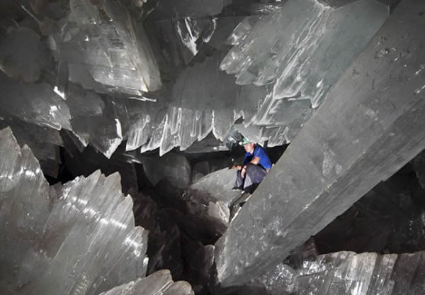 文中令人惊异的水晶洞照片由西班牙著名摄影师加维尔-特鲁巴拍摄,石膏晶体的体积叹为观止,其中一些的高度达到11米。这些晶体随着时间流逝缓慢生长,为何呈随意的角度仍是一个未知数。奈卡的地下巨矿已经挖掘多年,1975年,一个巨大区域内的水被排干,允许进行采矿作业。由于水的消失,晶体停止生长。25年前,两名矿工偶然间发现了巨大的水晶洞,洞内的石膏晶体令人难以置信。
