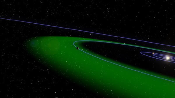 天文学家在距离地球41光年的巨蟹座55恒星系统中发现适宜生命居住带上的行星,这也是美国宇航局高度关注的系外行星之一。在这个系统中,天文学家认为有一个较大的行星位于可居住带地区,而可居住带上的水是呈液态。从图中可以看出,由美国宇航局喷气推进实验室模拟的行星轨道图像显示出围绕着中央恒星,存在着数颗行星,其中有较大的气态行星,也有岩质结构的行星。