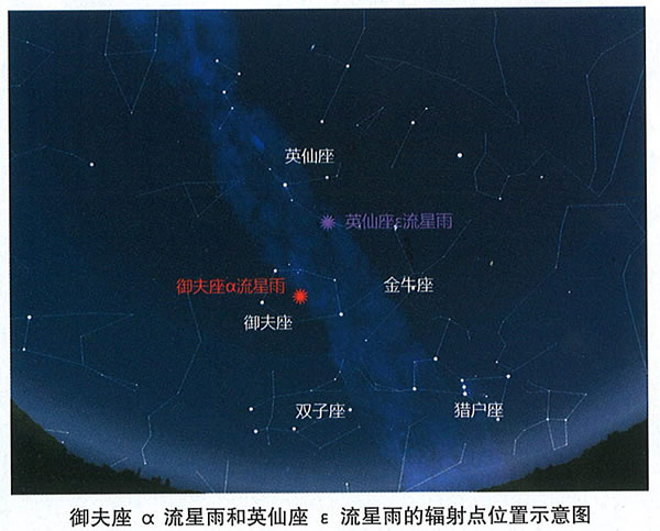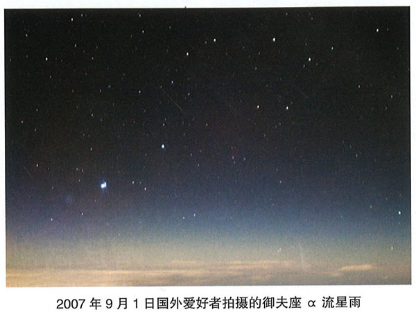 本月初率先进入大家视野的是御夫座α流星雨。该流星雨实际上从8月25日就已开始活动,并将持续到9月5日前后。近几年,通过对这个流星群观测资料的分析,其辐射点位置进一步得到了确认。但关于极大时的流量至今尚无定论。普遍认为,该流星雨的极大持续时间很短,且突然性很强,因此很容易被错过。历史上只有1935年、1986年和1994年里该流星雨极大时出现过每小时天顶流量达到30至40颗的情况。而且仅有三位观测者记录了1986年和1994年该流星雨极大的情况,因此科学家认为肯定有一些流量的高峰被错过了。果然在2007年,虽然当时的月相不利于观测,北美洲西部还是监测到了御夫座α流星雨的爆发,每小时的天顶流量曾达到130颗以上。并且雷达数据显示在极大过后不久,还有一个较小的爆发出现,但由于月光的严重影响,加之多数流星可能较暗,观测者没有看到这个后续的爆发。