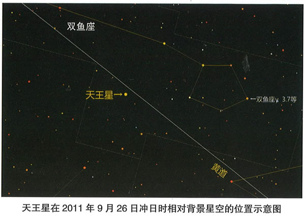 作为人类历史上最重要的天文发现之一,天王星将当时太阳系的尺度扩大了一倍。它与太阳的平均距离约为28.69亿千米,公转一圈需要84.3年。因此它的亮度较暗,相对于背景恒星的自行也比较缓慢。通常天王星的目视星等在6.0等左右,冲日时也不过5.7等。近期,天王星位于双鱼座区内,我们要想观测到它至少还是需借助双筒望远镜。
