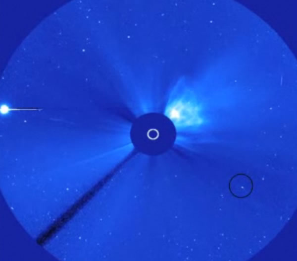 这是一次惊人的机缘巧合,当这颗彗星向太阳冲去时,太阳之前刚刚经历了一次日冕物质抛射(CME),向太空抛出数十亿吨高能带电粒子,以高达每小时500万公里的速度冲入太空深处。美国宇航局和欧洲空间局合作执行的“太阳和太阳风层探测器”(SOHO)拍摄的图像中,将太阳爆发和这颗彗星的自杀场景全部摄入镜头。