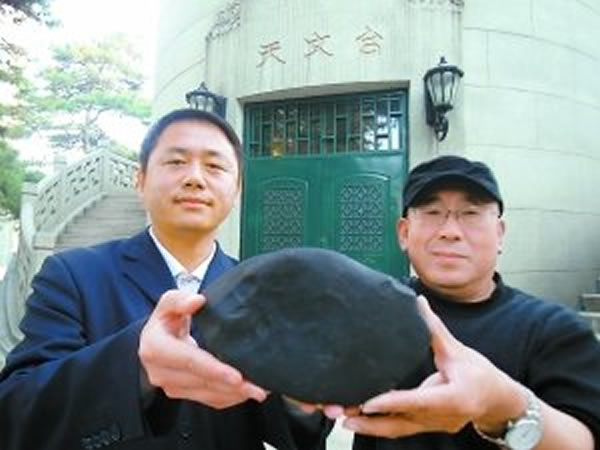 北京天文馆陨石专家张宝林(右)和吴静杰手捧陨石