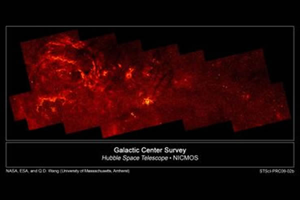 一张由哈勃望远镜的近红外照相机和多目标光谱仪(NICMOS)拍摄的银河系中心的假彩色合成图片。这张美国宇航局哈勃太空望远镜红外镶嵌图像是迄今为止对银河系中心最清晰的图片。它显示了新的大质量恒星群,以及天体中央在300×115光年左右的炎热的电离气体下的复杂结构细节,银河系核心在红外线可穿过的可见光中被尘埃云遮盖。新的NICMOS数据显示出电离氢气以及大量散布在该区域的大质量恒星。来自这个复杂结构中心的恒星风和辐射一定情况下,它们可能引发新一代恒星。在左上角,大圆弧的电离气体分解成有趣的线性队列表明该处是强大磁场影响的临界位置。左下角区域表明在五合星团中炙热的大质量恒星风雕刻成的气注。图像中间电离气体环绕在银河中心的黑洞周围,形成了一个嵌在管状环内的明亮螺旋。