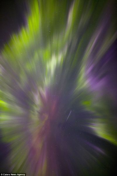 英国摄影师安东尼-斯宾塞拍摄的这张照片显示,一颗流星从极光中间穿过