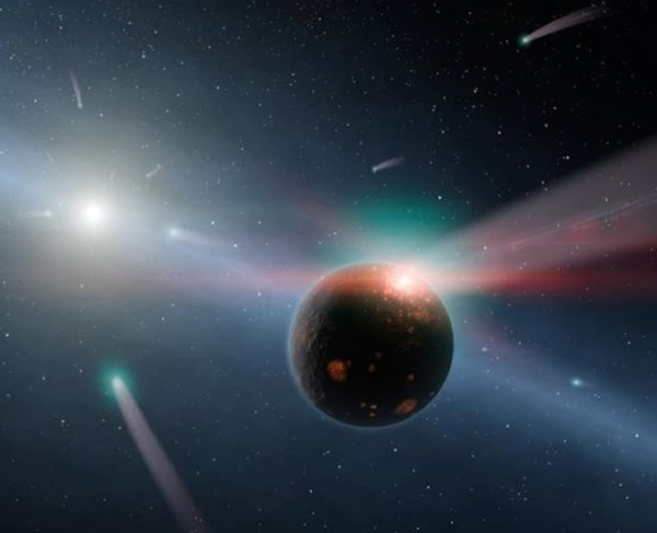 目前,科学家使用斯皮策望远镜观测埃塔乌鸦恒星周围存在着彗星大浩劫,这颗恒星位于距离地球50光年之遥的乌鸦星座。他们还发现一个温暖的灰尘环状结构环绕着埃塔乌鸦恒星,经过对该环状结构中的灰尘分析,证实它具有彗星粉末相同的化学成份。