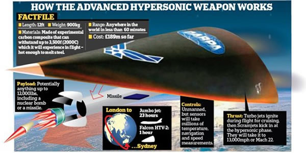 美国陆军先进超音速武器研究项目是“全球即时打击”计划的一部分,旨在为美军在1个小时之内向全球任何地区送递常规武器。科学家评估这种超音速武器的速度超过了5马赫——音速的5倍,时速可达到3728英里。