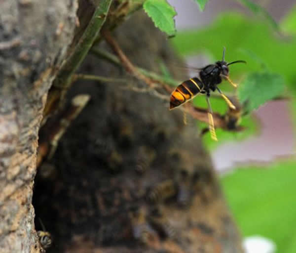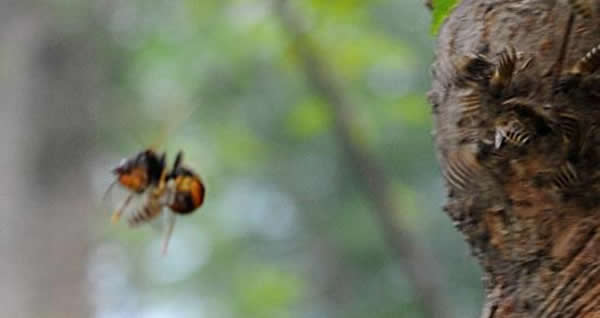 一只胡蜂在树洞口外"抓捕"回家的野生蜜蜂。