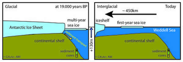 末次冰期的结束与南北极冰盖的消融过程提供了有关气候变化的基本信息,虽然北半球在末次冰期时的最大冰盖尺寸已经被研究得相当透彻了,但有关南极冰盖规模的可靠信息却仍旧少得可怜。最近,来自德国科隆大学的Michaer Weber博士、亥姆霍兹联合会阿尔弗雷德魏格纳极地和海洋研究所(Alfred Wegener Institute for Polar and Marine Research)的Gerhard Kuhn博士,以及俄勒岗大学、哈佛大学的研究者所共同进行的研究显示,南北半球冰盖达到最大规模并开始消融的时间相同,即为19000年前,这比之前认为的时间要早5000年。
