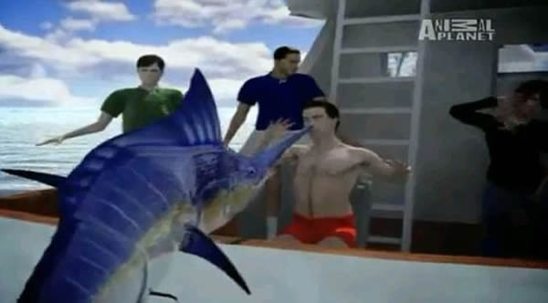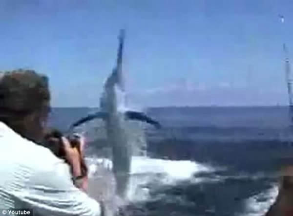 斯蒂芬回忆说,在这条鱼跳出水面之前,人鱼已经大战25分钟了。“它朝船相反的方向跳出过一次,那时离我有15英尺远(约合4.6米),随后又跌落回水里,紧接着再一次跃出水面,不过这次是朝着船的方向飞腾而来,刺穿了我的左脸颊,把我击倒在甲板上。”