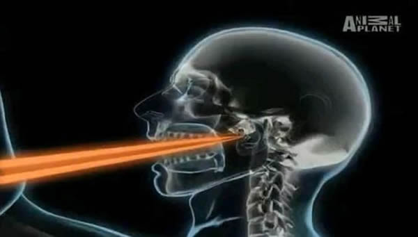 通过X线构建的图像展示了黑枪鱼刺到口腔的深度
