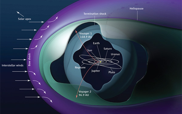 有时你自己的恒星会阻碍你了解其他恒星的诞生。特别是当天文学家想要搞清银河系恒星形成区域所释放的紫外线辐射——被称为莱曼-阿尔法——时尤为如此,这是因为它被认为非常强烈,又是恒星“托儿所”中情况的的一种关键的诊断型指标。莱曼-阿尔法起源于波长为1216埃(121.6纳米)的氢,然而具有相同波长的太阳光照射到从外部流入太阳系的气体时会模糊这种观察结果。幸运的是,美国宇航局(NASA)在1977年发射的“旅行者”号双子飞船—其路径如图中红线所示—均正在逃离太阳的势力范围:在11月中旬,“旅行者”1号飞船与太阳的距离相当于日地距离的118.9倍;而“旅行者”2号飞船的这一数字尽管为96.9,但也相当于冥王星与太阳距离的两倍多。