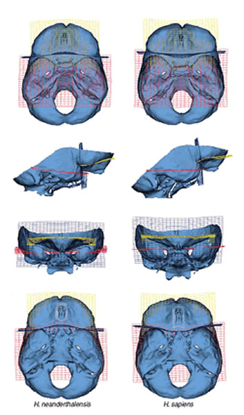 尼安德特人(左)与现代人类(右)的脑部对比图