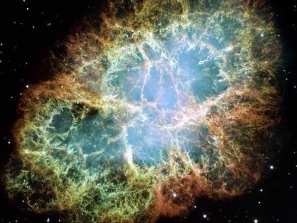 这是哈勃空间望远镜拍摄的蟹状星云,它是一次超新星爆发后留下的尘埃和气体遗迹