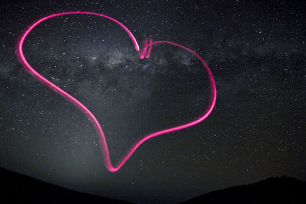 北智利的欧洲南方天文台的天文学家及摄影师朱利恩•吉拉德(Julien Girard)用闪电灯投影形成粉红色心形图案。照片拍摄于2011年10月20日,由欧洲南方天文台的官员于2012年2月13日公布。