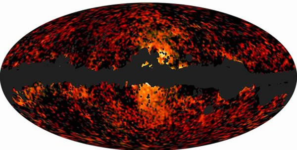 科学家利用普朗克望远镜的观测数据绘制的全天图,展示了银河系中央的一层“薄雾”。科学家尚不清楚这层“薄雾”如何形成