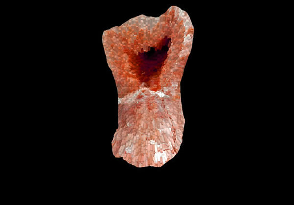 一个年轻尼安德塔人的右下方第三颗磨牙的咬合表面,有一点轻微的表面磨损。