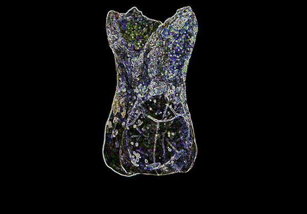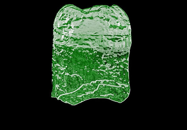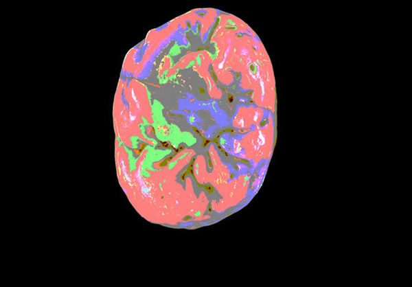 右下方第一颗臼齿的咬合视角,以不同的颜色突出了牙冠的形态学。