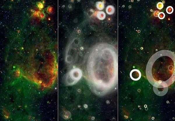 目前3.5万多位天文学爱好者从斯皮策望远镜中筛选数据,发现银河系中的泡沫结构——由年轻炽热恒星释放宇宙物质进入环绕其周围的气体和灰尘。