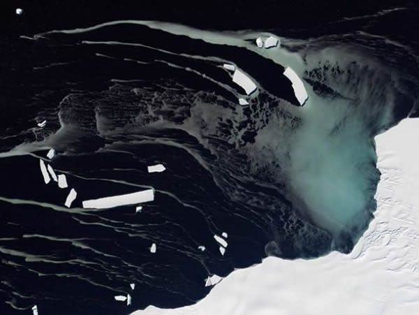 这是一张今年2月份拍摄并于近期公布的卫星图像,展示了南极埃默里冰架附近海域显出蓝绿色彩的水流。这种色彩可能源自纤细的片状和针状冰晶,这种冰晶是冰架下方深层海水上涌并发生凝结时形成的。尽管这些冰晶都非常微小,宽度仅有3~4毫米,但当它们的密度足够高时仍然能够造成洋面色彩的改变,正如这里展示的那样。