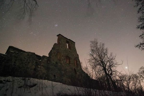 2月21日,瑞典乌普萨拉,一座废弃古堡上空的繁星点点。照片中可以看到昴星团,或称梅西耶-45,它正位于古堡正上方。
