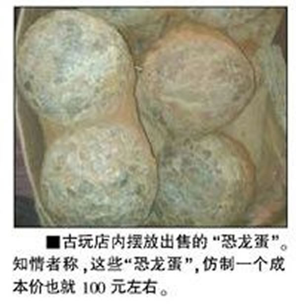 “我在这里可有熟人啊,你可别欺骗我。”店主见记者这么一问,盯着记者看了看后,从里屋搬出一个纸箱子说:“这里的全是真的,都是从西峡县的阳城、丹水和内乡县赤眉镇农户家收来的。而那些假的,是我们购买的,至于谁做的不清楚。一个假恐龙蛋的成本价大致100块钱左右。”