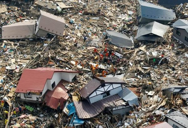 2011年3月14日,日本北部岩手县的野田村,身穿橙色制服的救援人员正在废墟中寻找遇难者遗体。据美国地质调查局的科学家估计,为了引发足以摧毁岩手县以及日本东岸的海啸,3天前发生在太平洋东北部的地震至少需要产生相当于475兆吨TNT的能量。这一能量相当于3.26亿桶原油,可满足全球4天的用油需求。