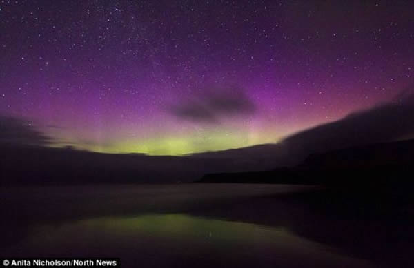 尼科尔森家住诺森伯兰郡的锡顿德勒沃尔,她说:“我专门来到埃格岛庆祝自己的生日。听到出现北极光消息后,我立即带着相机跑到海滩,花了几个小时捕捉下绚丽的景象。我的好友麦克-莱德利是一位摄影师,他对我说‘眼睛要一直盯着天空’,我照办了。我能够清楚地看到北极光,但却看不到它们的颜色。直到看照片时,我才发现它们绚烂的色彩。英国很少出现北极光,这是我重新工作前的最后一次旅行,能够拍到北极光实在非常幸运。”