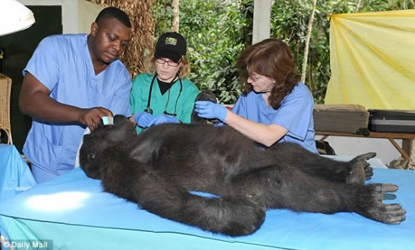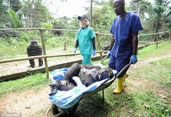 霍根先让苏菲服用了口服镇静剂。不久,它陷入昏迷状态,用双臂搂着霍根肩膀。然后,它被注射麻醉剂。兽医用独轮手推车把它小心翼翼地送到临时手术室,这里原本是个校舍,窗子上没有玻璃,外面挂着塑料薄膜,防止昆虫进到里面。