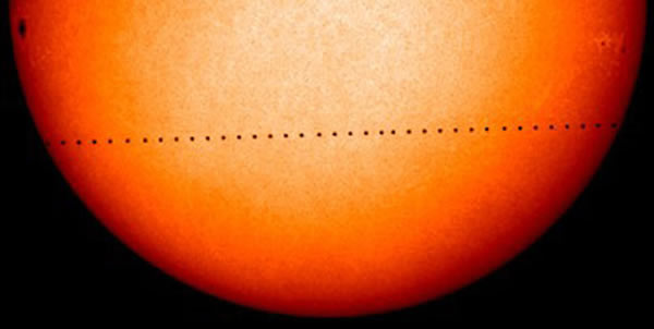 2006年“水星凌日”时,SOHO探测器所拍摄到的水星经过太阳表面的路径