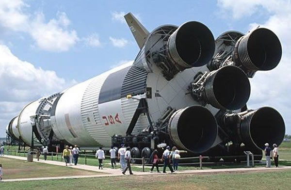 在1969年7月16日,土星五号重型运载火箭第一级发动机经过数分钟的工作,将尼尔·阿姆斯特朗(Neil Armstrong)、奥尔德林(Buzz Aldrin)以及迈克尔·柯林斯(Michael Collins)推至距离地面38英里,此后F-1发动机便用完所分配的燃料而被分离,并坠入海洋中,接着由火箭的第二级发动机接管飞行。图中显示的是土星五号火箭第一级与第二级发动机分离时的情景。诸如F-1引擎这样的火箭第一级发动机,是一种消耗性的部件,燃烧结束后便坠入预定海域中而被人遗忘。