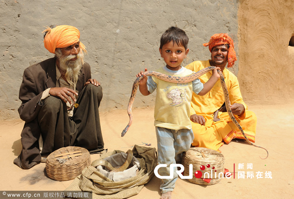 耍蛇是印度一项传统娱乐表演,尽管由于野生动物保护法日益严格,这种表演已经属于违法行为,一些世代耍蛇的家族依然在靠此谋生养家,甚至一名年仅2岁的男孩也继承了这门手艺,敢于与眼镜蛇共舞。