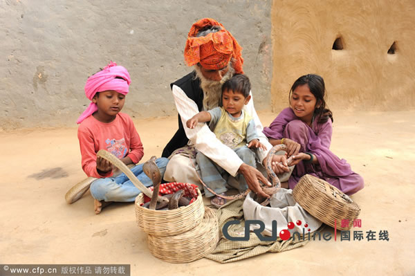 耍蛇人布德赫·纳斯在教孙子们耍蛇手艺
