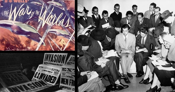 在1938年的万圣节夜晚,一个关于赫伯特·乔治·威尔斯(H.G. Wells)的科幻小说《世界大战》被一个无线电节目所广播,人们当时相信外星人正在入侵美国。然而,这竟然是著名节目主持人奥森·威尔斯(Orson Welles)一次精心安排的广播内容。图中记录了他在第二天回答记者提问时的情景。