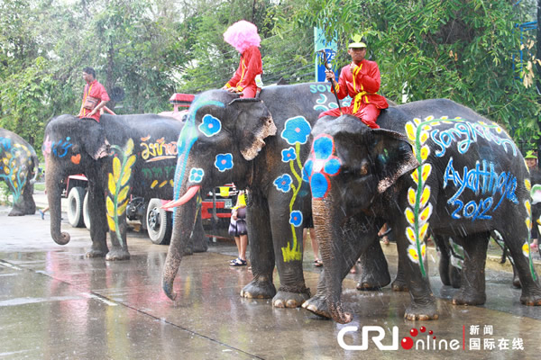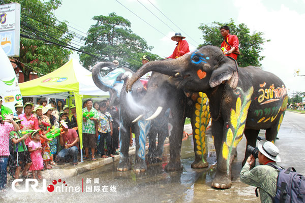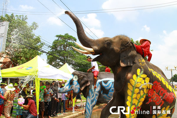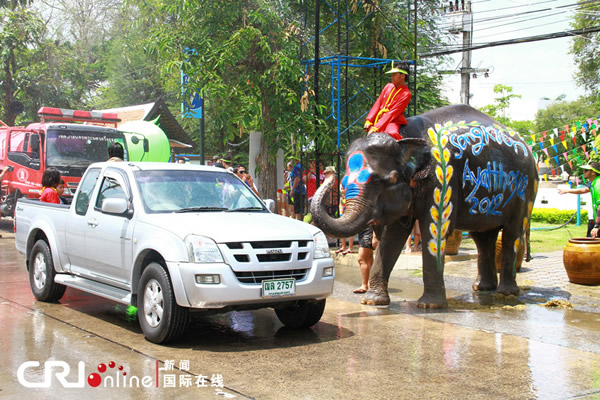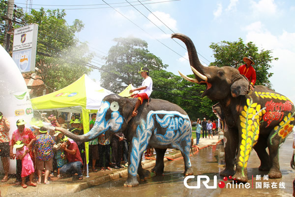 13日,是“宋干节”的第一天,在大城旅游中心门前的主干道上,当天活动的主持人一大早就在音乐的伴奏下卖力地招呼着来自世界各地的游客,不断催热现场气氛。7只被涂得色彩斑斓的大象在骑师的指挥下,向过往的游人和车辆喷水。所有路过的车辆和游人在这些两、三米高的庞然大物面前,只得“乖乖被浇”。而和大象的亲密接触,也让来自德国的雷吉纳女士激动不已:“我们全家来自德国,上次过‘泼水节’,还是20年前在中国云南的傣族乡村。这是我们第二次过‘泼水节’,我们都太喜欢这儿了,太好玩儿了。”