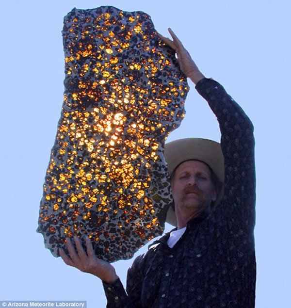 美国亚利桑那州西南陨星实验室的马文-基尔戈尔举起“富康陨石”,阳光可照射穿透该陨石,呈现出美丽的蜂窝状结构。