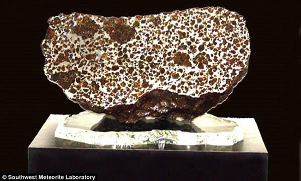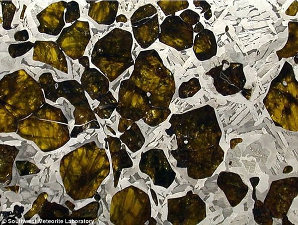 该亚历桑那州实验室的研究专家称,这块橄榄绿陨石一半是由镍-铁,一半是橄榄石,从而呈现出马赛克的效果,看上去颇似形成行星的神秘残骸物质。