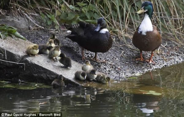 给予保护:遭到袭击后,鸭爸爸和鸭妈妈小心保护着这个变小的家庭