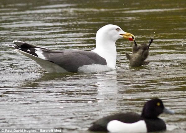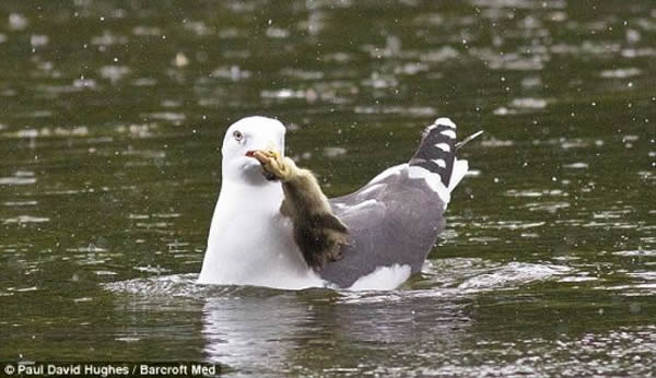 捕猎者:海鸥迅速把小鸭子从水里拖出来